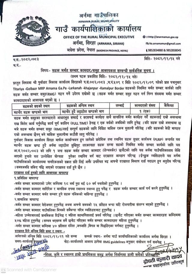 सडक मर्मत कामदार आवश्यकता सम्बन्धी सूचना ।